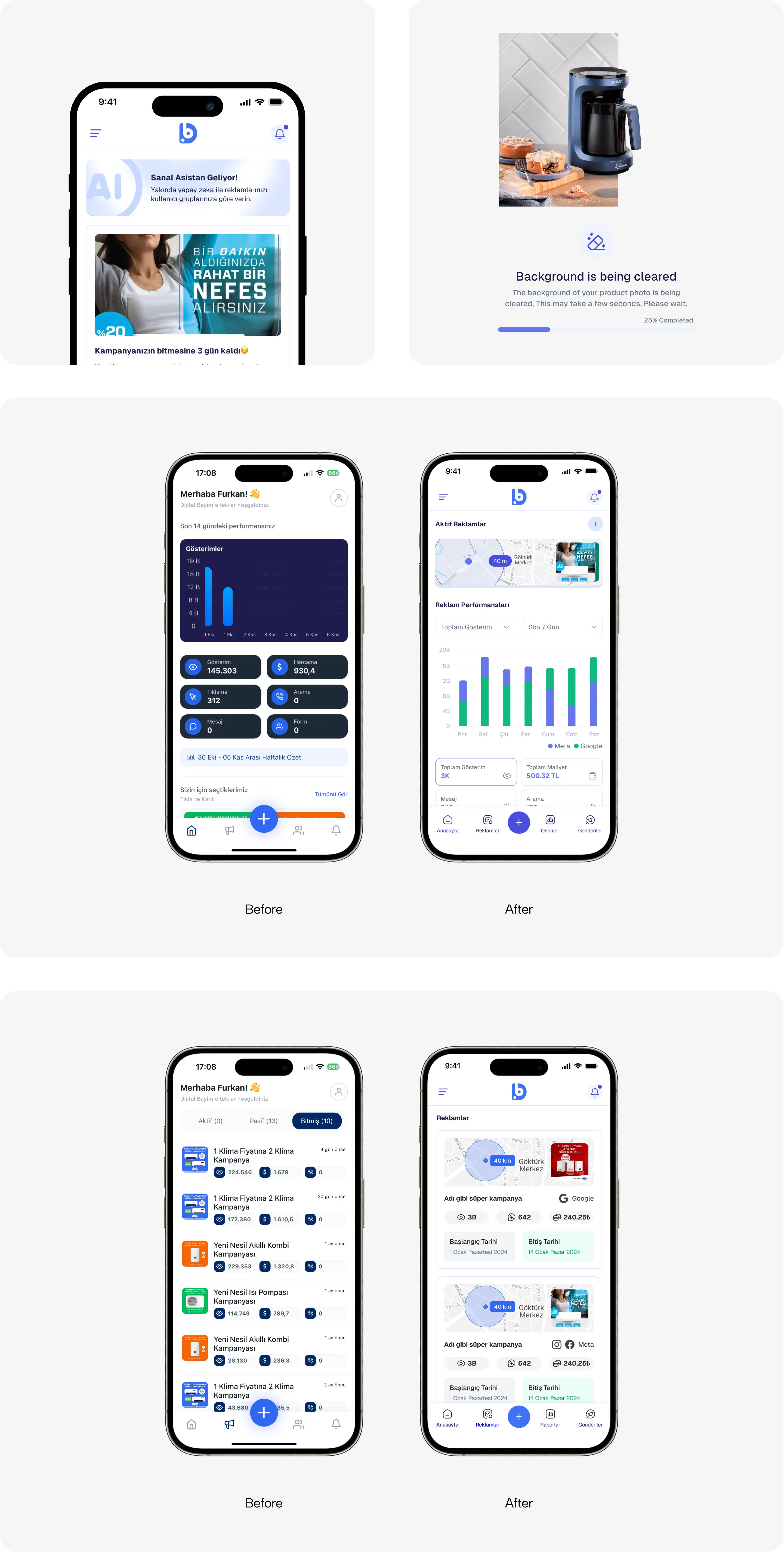 We aimed to enable branches to track their real-time advertising performance through clear summaries and develop their strategies with personalized reports. We provide detailed insights into campaign scope, publishing dates and duration, engagement metrics, conversion rates, follower growth, and customer communication channels.